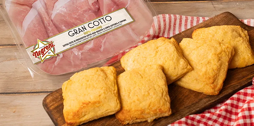 Prelevate una porzione di impasto di patate e, con l’aiuto di un coppapasta, create uno strato alto circa 4 mm. Procedete fino a metà dell’impasto. Farcite ogni quadrato con mozzarella e Gran Cotto 100% italiano Negroni quindi chiudete con un secondo strato di patate preparato con la seconda metà dell’impasto di patate e con le stesse modalità dei precedenti.