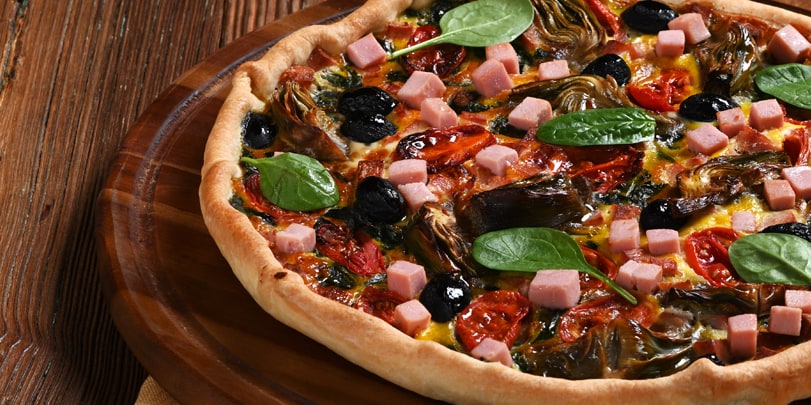 Spinate i carciofi, eliminate la barbetta interna e tagliateli a spicchi, poi disponeteli in una terrina con acqua fredda e mezzo limone. In questo modo non diventeranno neri. In una terrina mettete le uova, la ricotta e insaporite con sale e pepe. Mescolate molto bene e aggiungete al composto i Cubetti di Prosciutto Cotto, gli spinaci e le olive. Tagliate i pomodorini a metà. Stendete la pasta frolla salata in una teglia e aggiungete il composto di uova. Unite i pomodorini e i carciofi. Aggiungete un filo di olio extravergine di oliva e infornate a 180°C per 30 minuti circa. Prima di servire aggiungete altri spinaci che daranno freschezza a questa torna coloratissima e gustosa.