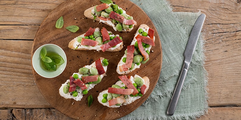 Bruschetta estiva con fave e piselli, speck croccante e caprino