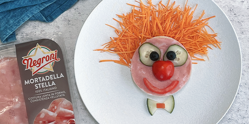 Tagliate il pane bianco con un coppapasta tondo ricavando un cerchio di circa 8-10 cm di diametro. Se non avete il coppapasta potrete usare un bicchiere o una ciotola. Sistemate il cerchio di pane al centro del piatto e con lo stesso coppapasta ricavate un cerchio uguale da due fette di Mortadella Stella Negroni. Disponete le fette di mortadella sul pane e procedete con la decorazione.