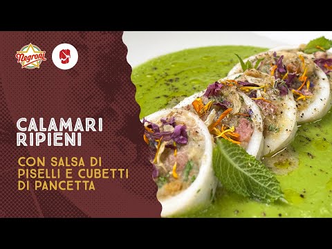 Calamari ripieni con cubetti di pancetta e salsa di piselli
