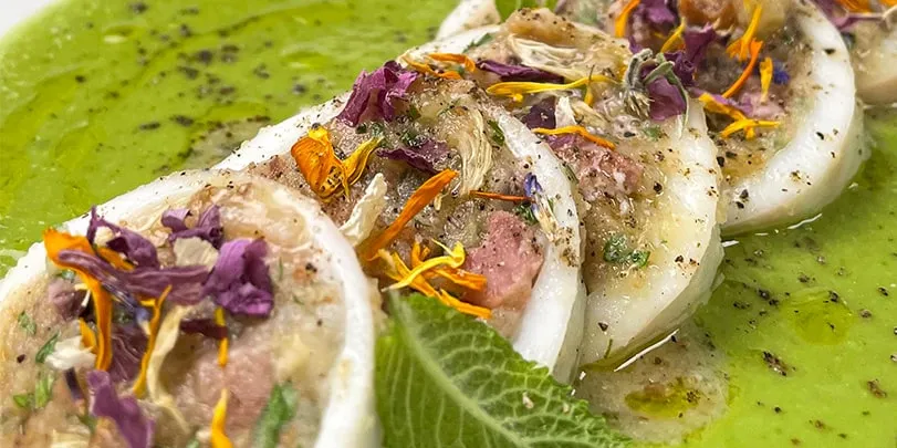 L’abbinamento seppie e piselli è un grande classico della cucina italiana ed è proprio partendo da questa solida base che Chef Lello ha preso ispirazione per creare una nuova ricetta. I piselli si trasformano in una piacevolissima crema, rinfrescata dalla menta e, invece delle seppie vengono utilizzati i calamari. Questi sono poi farciti con i loro stessi tentacoli insieme a patate, pane e Cubetti di Pancetta Affumicata Negroni croccante che rende il ripieno saporito e gustoso. Molto bella anche la decorazione del piatto che si colora grazie ai fiori edibili e invoglia subito a provare un boccone di calamaro pucciato nella verdissima crema. Una prelibatezza unica!