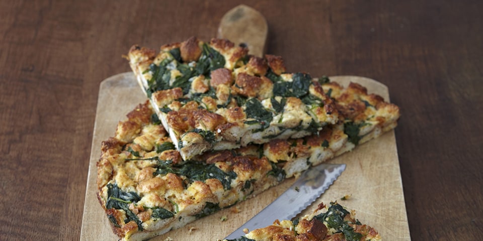 Servite una focaccia rustica di spinaci, pancetta e speck per un brunch della domenica con gli amici, completando il menù con altre ricette sfiziose preparare dallo chef Simone Rugiati per Negroni: