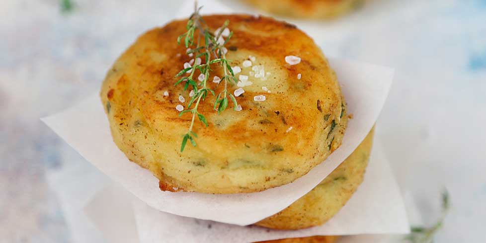Sistemate le frittelle sulla carta da cucina e decorate con dei rametti di timo che profumeranno le frittelle di patate. Servite ancora calde.