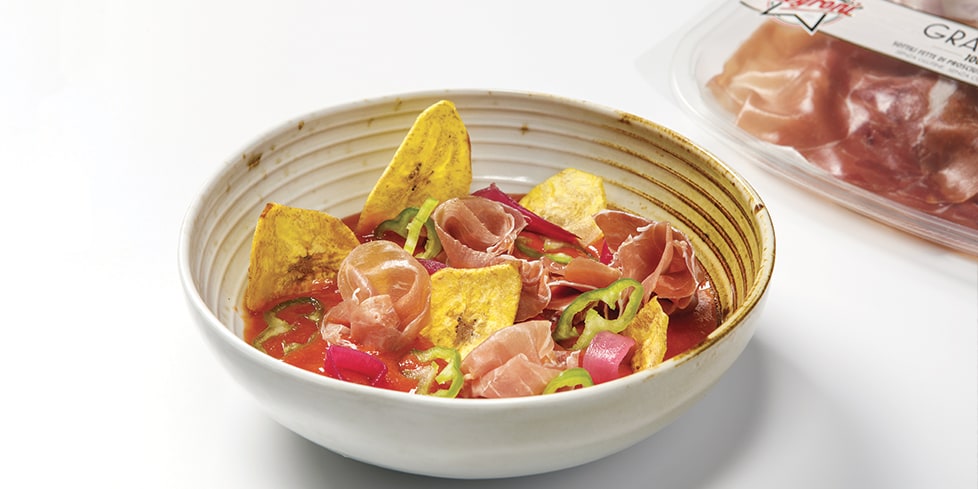 Durante un aperitivo con gli amici, conquistate i loro palati, oppure conquistate il vostro partner in una cena romantica coi fiocchi. Protagonista indiscusso di questa ricetta di Simone Rugiati è il Gran Crudo 100% italiano Negroni che con la sua delicatezza incontra la croccantezza del platano fritto e le noti forte e decise del peperoncino jalapeno e della cipolla. Ecco come preparare la ricetta del gazpacho più originale che c'è!