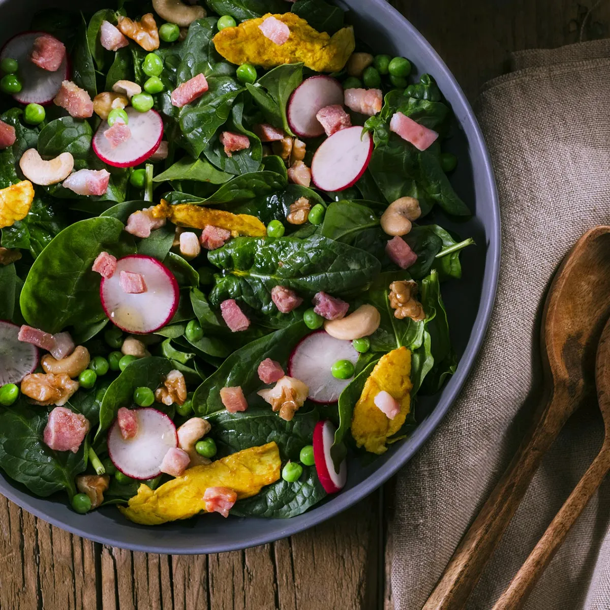 Insalata di primavera con cubetti di pancetta e sottilissime di pollo