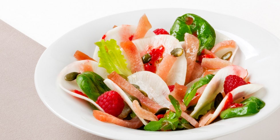 Lavare e pelare le rape bianche, tagliarle con l’affettatrice o al coltello a fette sottili e lasciarle qualche minuto in acqua ghiacciata. Tostare i semi di zucca in una padella antiaderente a fuoco medio per 2/3 min girandoli spesso. Sciacquare i lamponi, asciugarli (tenetene 8 da parte), frullare il resto dei lamponi con sale, pepe, olio evo, il succo del limone. Componete l’insalata con il songino, le rape scolate, i semi di zucca, i lamponi interi e infine Petali petto di Tacchino e concludete il piatto con la citronette ai lamponi.