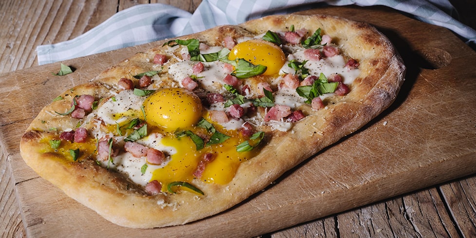 Ideale per un aperitivo tra amici, oppure per una cena in famiglia o sul divano, davanti alla tv: la pizza è da sempre un grande classico che mette tutti d'accordo, grandi e piccini. In questa variante, inoltre, porterete in tavola una ricetta originale e vivace: la pizza alla carbonara con uova, pancetta, scaglie di pecorino e basilico è una rivisitazione della famosa ricetta "Bismark", ma impreziosita da nuovi ingredienti, capaci di renderla davvero unica.