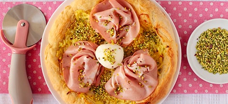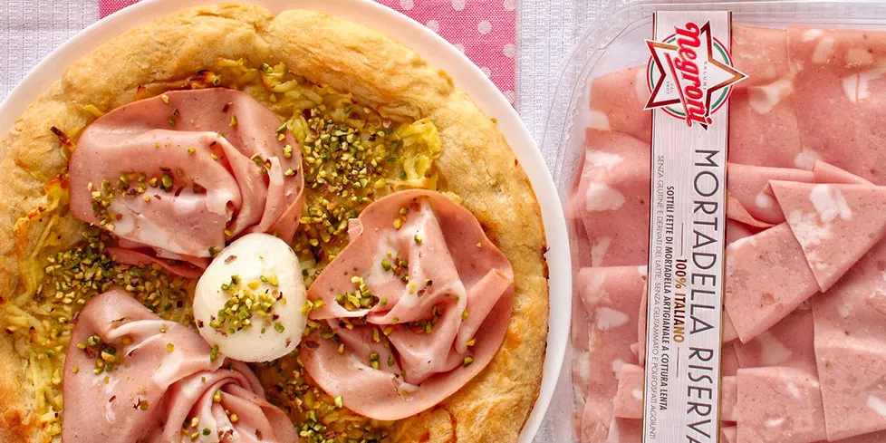 Una volta cotta, tirate la vostra teglia da pizza fuori dal forno e completate la sua decorazione con Mortadella Riserva 100% italiana Negroni, i bocconcini di mozzarella di bufala e la granella di pistacchio.