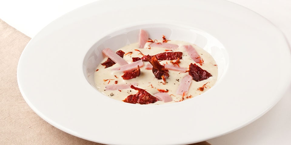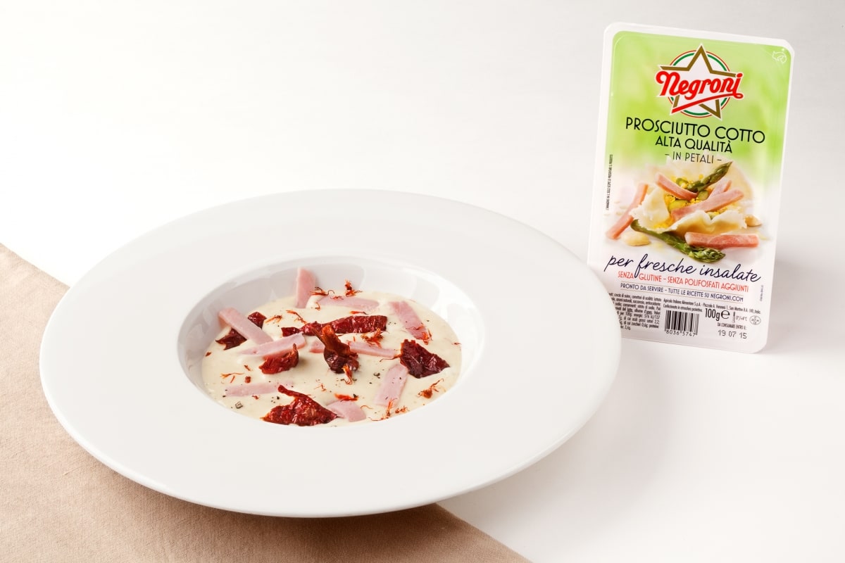 Con un mixer ad immersione frullate il composto fino a creare una crema spumosa, versatela su un piatto da portata e aggiungete i petali di prosciutto cotto Negroni, i peperoni cruschi ( sono dei peperoni fritti ed essiccati tipici della Lucania) sbriciolati e una grattugiata di pepe a mulinello.