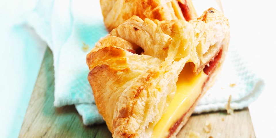 Per preparare lo strudel salato srotolate un rotolo di pasta sfoglia e spennellatelo con un tuorlo d'uovo. Create fino a tre quarti della sfoglia uno strato di salame e uno di formaggio semiduro come il caciocavallo, dopo averli tagliati a dadini.