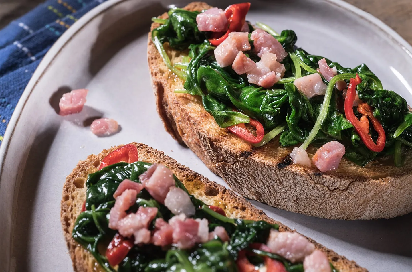 Semplice e veloce da preparare, questo piatto diventa un antipasto per un pranzo della domenica: la vivacità della Pancetta affumicata Negroni, il gusto riconoscibile del peperoncino e dell'aglio; non mancano poi gli spinaci e, per rendere ancor più armonioso questo incontro di sapori, non mancheranno le uova e le scaglie di pecorino.