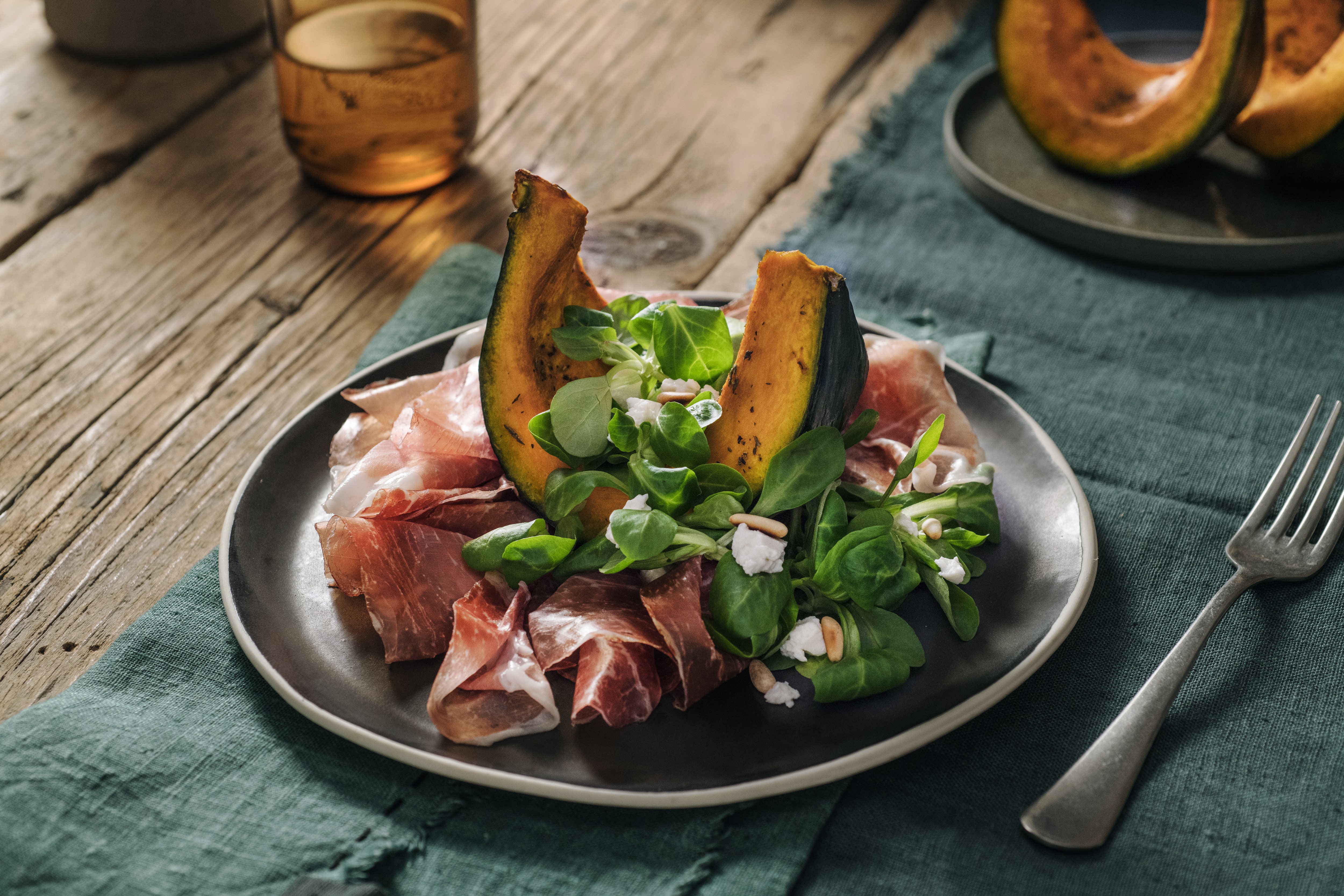 Nel frattempo preparate l’insalata, conditela con olio extravergine di oliva e sale, aggiungete il formaggio primosale tagliato a cubetti e i pinoli appena saltati in padella. Una volta pronta la zucca, sistemate in ogni spicchio l’insalata e servite con il Culatello di Zibello D.O.P. 100% italiano Negroni a parte.