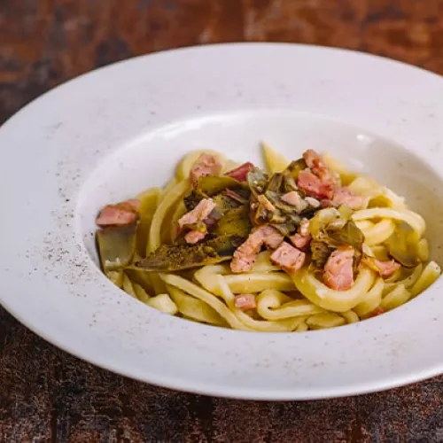 Torta di rose con cubetti di pancetta affumicata Negroni e spinaci