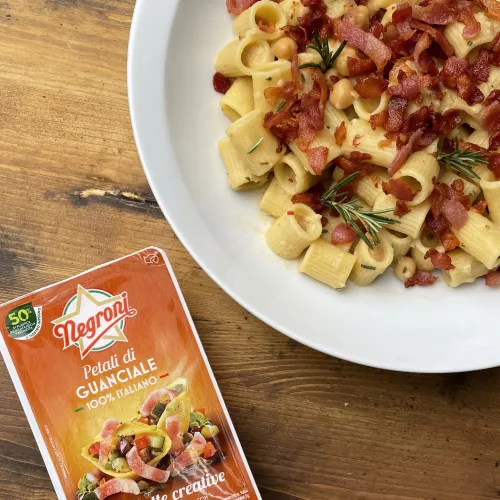 Pasta gratinata con stick di guanciale Negroni e mozzarella