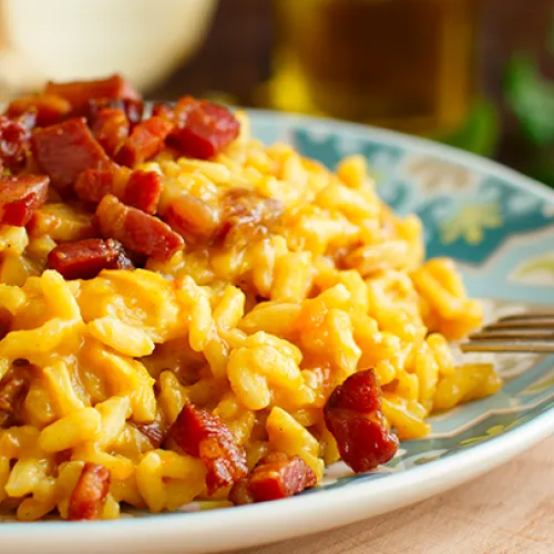 Pasta gratinata con stick di guanciale Negroni e mozzarella