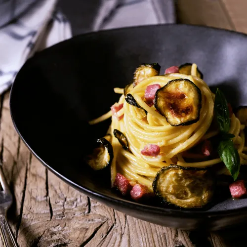Crespelle con Cubetti di Pancetta Affumicata Negroni e zucca