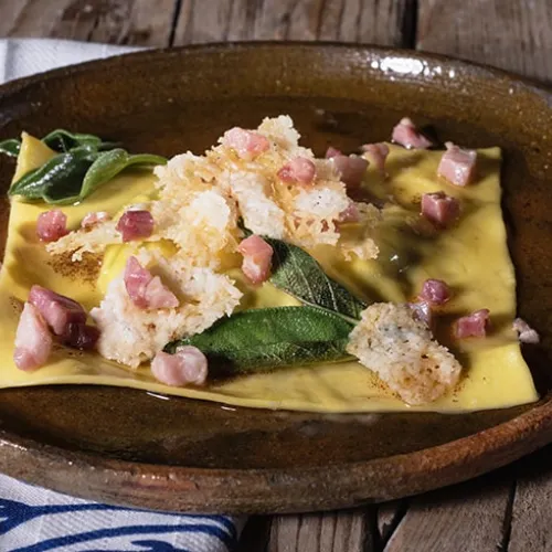Raviolo ripieno di tuorlo fuso e pancetta con cialde di pecorino