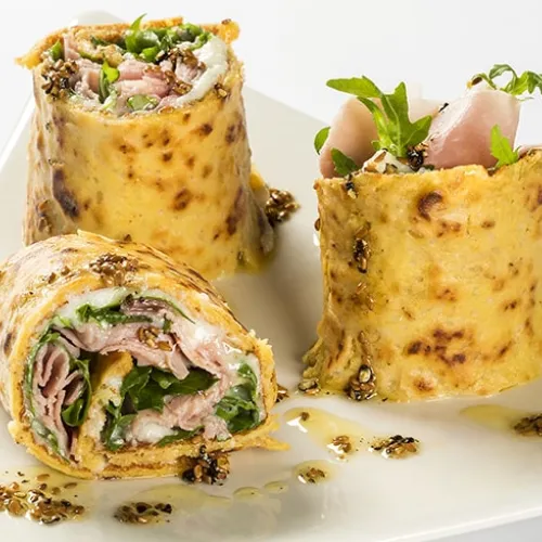 Rolls di piadina di ceci al sesamo con rucola, stracchino e prosciutto