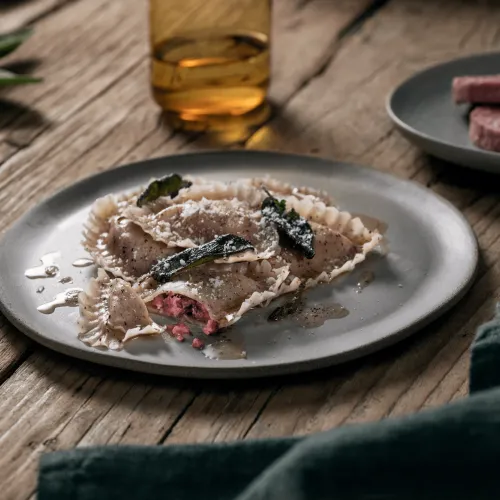 Crespelle con Cubetti di Pancetta Affumicata Negroni e zucca