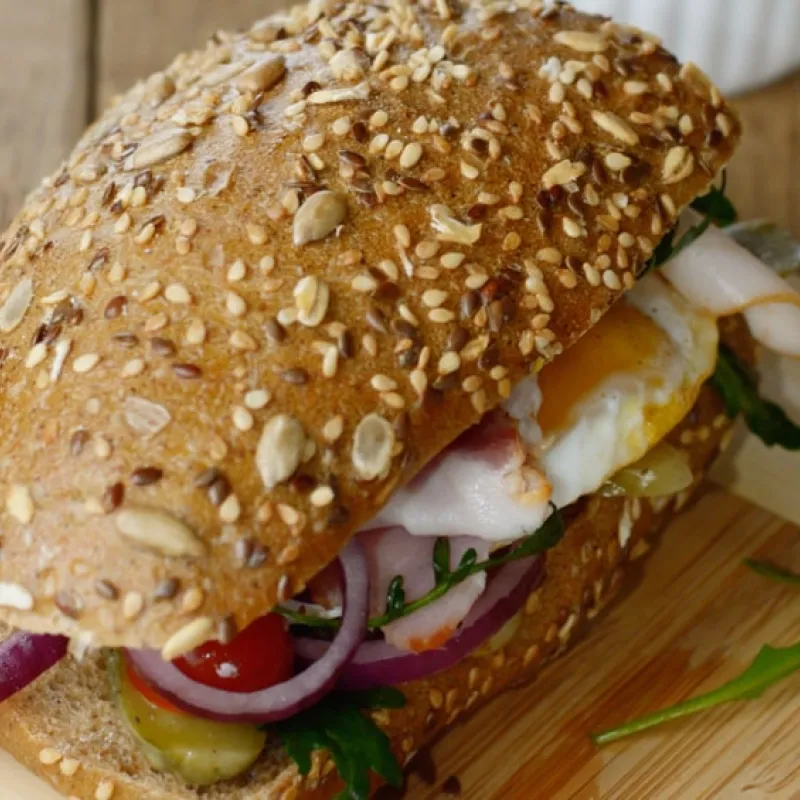 Wurstbrot con uova, cipolla, pancetta e rucola