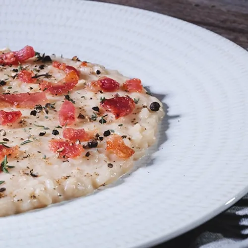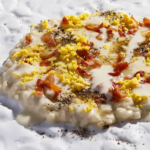 Risotto cacio e pepe, tuorlo e pancetta croccante