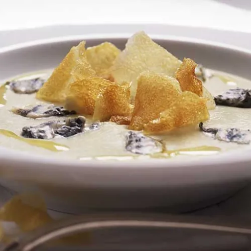 Fusillone con crema di zucca, briciole di cotechino e uova di lompo