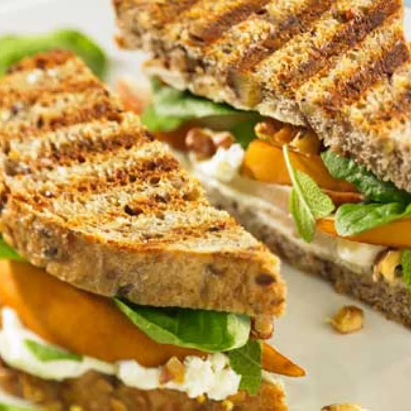 Pancake salati di zucca con prosciutto cotto, caprino e semi di papavero